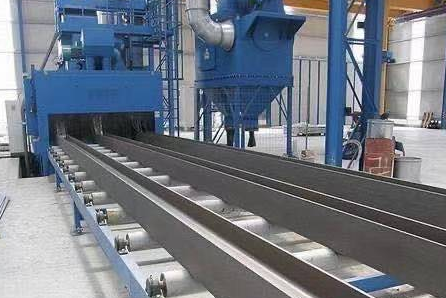 钢结构抛丸清理机系列产品是针对型钢和焊接钢结构件在涂漆前完成抛丸清理达到钢材预处理标准而设计制造的专用设备。该系列机采用辊道通过式方式设计,主要结构包括:清理室体、辊道系统、弹丸循环系统、抛丸器、尾吹系统、气动系统、电气系统和除尘系统。辊道承载工件经输入辊道运至抛丸清理室,多台抛丸器运转加速弹丸轰击工件表面,有效地去除工件表面锈蚀、氧化皮、焊渣,获得一定粗糙度及表面压应力的金属本色表面,以提高涂漆附着力并延长钢结构件的使用寿命,达到抛丸清理的目的。