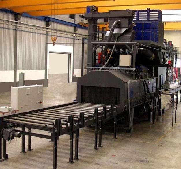 落入钢材上面的弹丸与锈尘经吹扫装置吹扫,撒落下来的丸尘混合物由回收螺旋输送到室体漏斗、纵横向螺旋输送机汇集于提升机下部再提升到机器上部的分离器里,分离后的纯净弹丸落入分离器料斗中内,供抛丸循环使用。通过式抛丸机抛丸清理中产生尘埃,由抽风管送向除尘系统,净化处理后的净气排放到大气中,颗粒状尘埃被捕捉收集通过式抛丸机主要用于建筑、桥梁等行业用大型工字型钢、等较高的钢结构件消除应力及表面除锈清理。