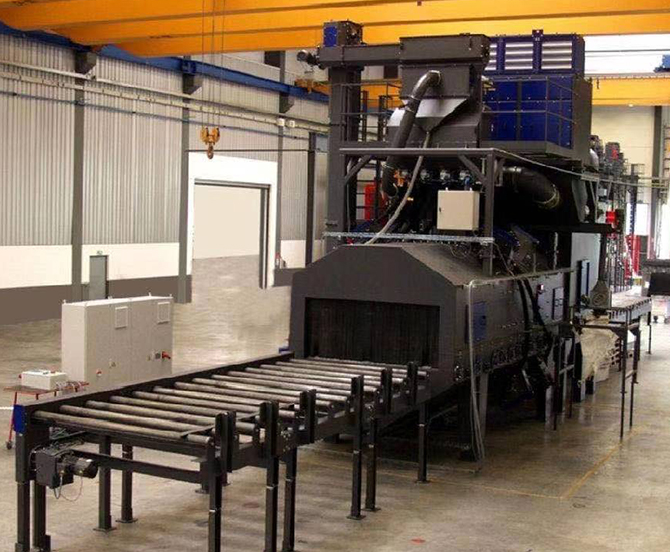 爬架抛丸机一般采用通过式抛丸清理,辊道输送将爬架往抛丸清理室内输送一边抛丸一边往抛丸清理室外输送,整个工作过程无死角。爬架抛丸机的工作原理如下: