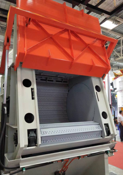 第四,将履带放入到清理室中,对于比较大的履带可以使用室体顶部开眼,用钢丝穿入悬吊的方式安装,也可以在抛丸器叶轮位置固定一个手拉葫芦来拉动履带。