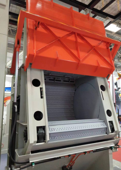 履带式抛丸机主要结构包括:抛丸清理室、丸料循环系统、抛丸器、清丸装置、供丸系统、除尘系统和电控系统等部件。