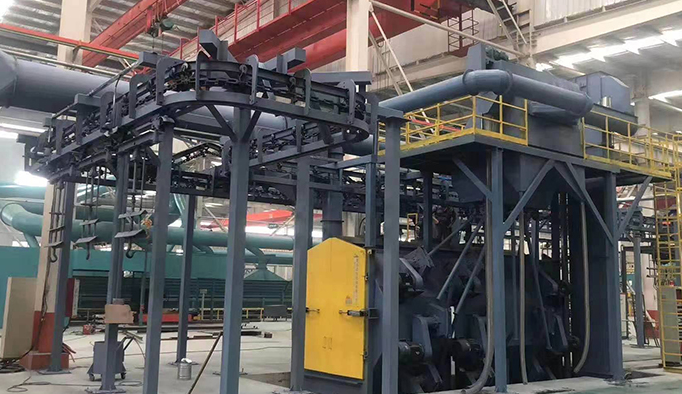 5、工件承载体采用龙门架结构,可保证工件在悬链吊挂下无障碍自由连续输送,用户可根据自己不同工件的要求随意调整抛丸清理时间,以控制生产率与清理质量。工件可连续不断的进行装料、双工位抛丸清理、卸料。