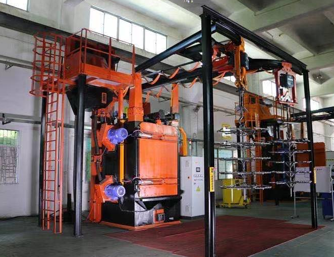 双吊钩式抛丸机由两个吊钩装载工件交替进入抛丸清理室内。利用抛丸器将0.2~0.8的弹丸抛向工件的表面,使得工件的表面达到一定的粗糙度,让工件变得美观,或者改变工件的压应力提高寿命。本机型广泛应用于铸造、建筑、化工、电机、机床等行业的中、小型铸、锻件的表面清理或强化处理。
