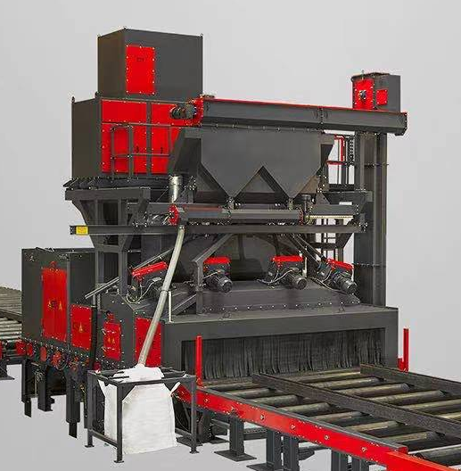 超市货架通过式抛丸机主要用于清理货架、货柜、工字钢等,抛丸机抛丸室体为双层结构,其外部室体采用钢板焊接而成,内层为含铬耐磨板,采用积木式安装结构形式,结构紧凑,密封性好,维修十分方便。